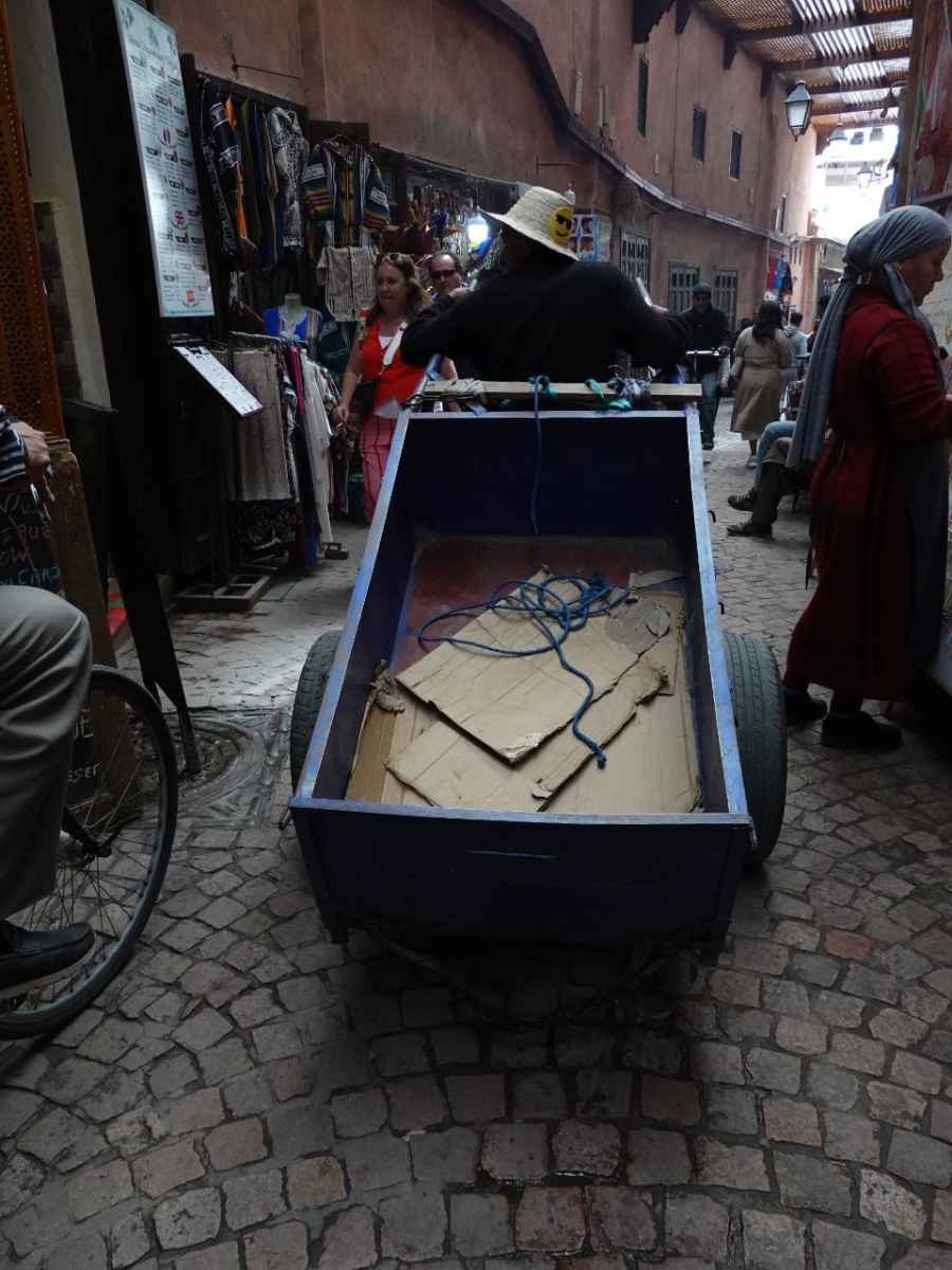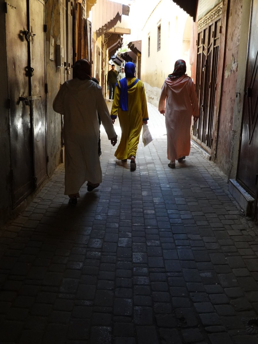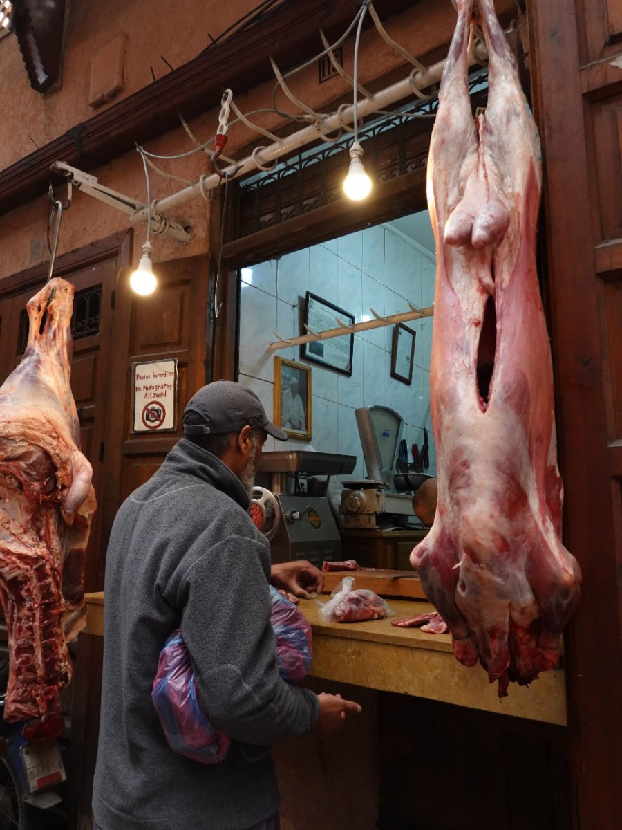 As we drove down towards Marrakesh we passed through tiny villages where the local Muslim men and women were traditionally dressed. There were small market stores or shop fronts selling groceries, meat, fruit and vegetables, clothing and all the necessities of life.