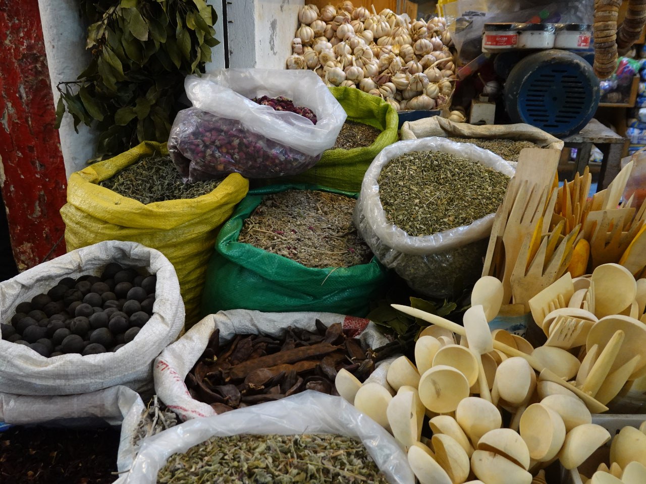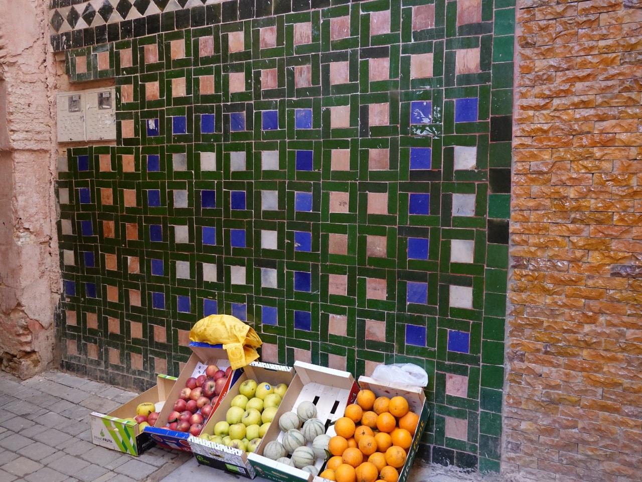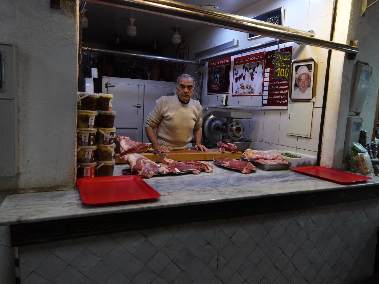As we drove down towards Marrakesh we passed through tiny villages where the local Muslim men and women were traditionally dressed. There were small market stores or shop fronts selling groceries, meat, fruit and vegetables, clothing and all the necessities of life.